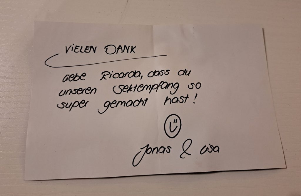 Ricarda hat den Sektempfang für unseren großen Tag organisiert und durchgeführt. Was uns wichtig war, hat Ricarda zuverlässig umgesetzt. Mit ihrer offenen und sympathischen Art kam sie sehr gut bei unseren Gästen an – sowohl bei den Erwachsenen als auch bei den Kleinen. Alles hat wunderbar geklappt.